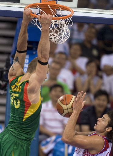 Lithuania's Robertas Javtokas (L) dunks against Croatia in their preliminary round group A basketball match at the Beijing 2008 Olympic Games on August 16, 2008.[Agencies]