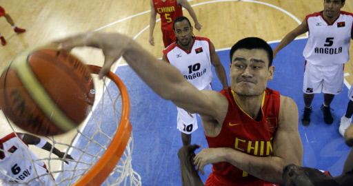 China's Yao Ming dunks over Angola's Leonel Paulo (bottom-R) as Armando Costa (R) and Joaquim Gomes watch during their men's preliminary basketball game at the Beijing 2008 Beijing Olympic Games in Beijing on August 14, 2008.[Agencies]