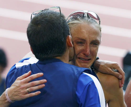 34-year-old Paula Radcliffe of Britain (R) is comforted by her husband Gary Lough after the women's marathon of the athletics competition of the Beijing 2008 Olympic Games in the National Stadium August 17, 2008.She is the world record holder for the women's marathon, which she set in 2003. Paula Radcliffe placed 23rd. [Agencies]
