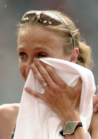 Britain's Paula Radcliffe cries after the women's marathon at the National Stadium, also known as the "Bird's Nest" in the 2008 Beijing Olympic Games on August 17, 2008.She is the world record holder for the women's marathon, which she set in 2003. Paula Radcliffe placed 23rd. [Agencies]