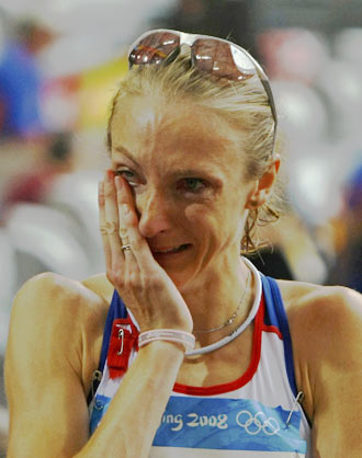 Paula Radcliffe of Britain reacts after the women's marathon in the athletics competition during the Beijing 2008 Olympic Games in the National Stadium August 17, 2008.Paula Radcliffe placed 23rd.[Agencies]