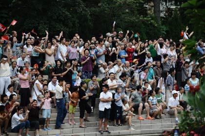 People cheer the participants of the women's marathon during the 2008 Beijing Olympic Games on August 17, 2008 in Beijing. Constantina Tomescu gave Romania their first ever women's Olympic marathon title here on Sunday as she won in a time of 2hours 26minutes 44second. Kenya's Catherine Ndereba placed second ahead of China's Zhou Chunxiu.[Agencies]