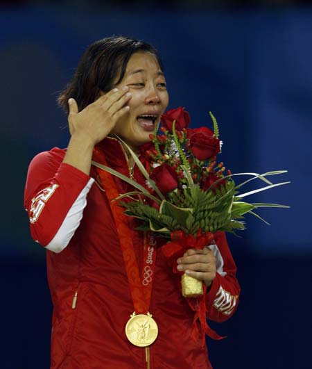Carol Huynh of Canada cries tears of joy after winning the gold medal in the 48kg women's freestyle wrestling at the Beijing 2008 Olympic Games August 16, 2008. [Agencies]