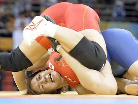 China's Wang Jiao (blue) fights with Japan's Kyoko Hamaguchi during their women's 72kg freestyle semi-final wrestling match at the 2008 Beijing Olympic Games at the China Agricultural University Gymnasium in Beijing on August 17, 2008. [Agencies]