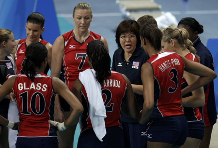U.S. head coach Lang Ping talks to her players during their women's preliminary pool A volleyball match against Venezuela at the Beijing 2008 Olympic Games August 13, 2008. [Agencies]