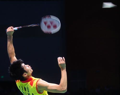 Lin Dan of China returns a shot during his men's singles final badminton match against Lee Chong-wei of Malaysia at the Beijing 2008 Olympic Games August 17, 2008. [Agencies]