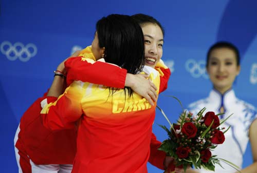Wu Minxia (facing camera) of China congratulates her compatriot Guo Jingjing after Guo won the gold medal in the women's 3m springboard diving final at the National Aquatics Center during the Beijing 2008 Olympic Games August 17, 2008. [Agencies]