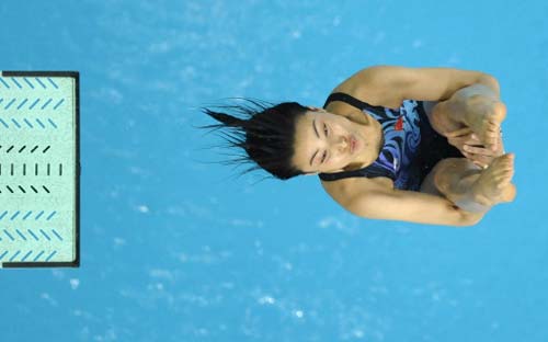 Guo Jingjing of China dives during the women's 3m springboard diving final at the National Aquatics Center during the 2008 Beijing Olympic Games in Beijing on August 17, 2008. Guo Jingjing of China won the gold medal in the women's 3m springboard diving final, followed by Julia Pakhalina of Russia with silver and Wu Minxia of China with bronze. [Agencies]