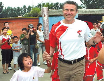Sergey Bubka and Zhai Yufeng hold an Olympic torch at the Sun Village yesterday in Beijing. [China Daily]