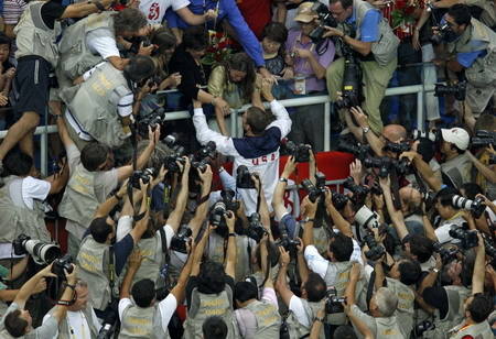 Photographers take pictures as Michael Phelps (C) of the US is congratulated by his mother Debbie after winning his eighth gold medal of the games at the National Aquatics Center during the Beijing 2008 Olympic Games, August 17, 2008. [Agencies]