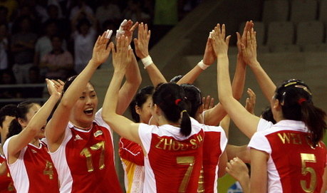 China's women's volleyball team celebrate after defeating Japan 3-0 during their women's preliminary pool A volleyball match of the 2008 Beijing Olympic Games on August 17, 2008 in Beijing. [Agencies]