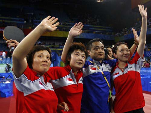 (L-R) Wang Yuegu, Feng Tianwei, coach Liu Guodong and Li Jiawei, the table tennis team of Singapore, celebrate their victory against South Korea after the women's team semifinal match at the Beijing 2008 Olympic Games August 15, 2008. Liu Guodong is the brother of Liu Guoliang, head coach of Chinese men's table tennis team.[Agencies]