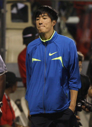 Liu Xiang of China walks off the track after announcing to the crowd his decision to pull out of the men's 110 meters hurdles race at the Reebok Grand Prix athletics meet in New York May 31, 2008. Liu decided not to run because of a tight hamstring muscle in his leg. [Agencies