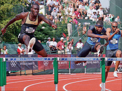 From left: Kerron Clement, Bershawn Jackson and Angelo Taylor compete in the men's 400m hurdles final of the US Track and Field Olympic Trials two months ago in Eugene, Oregon. [Agencies]