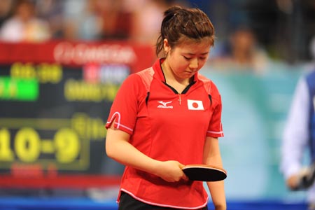 Fukuhara Ai of Japan competes during the women's team bronze medal contest between Japan and the Republic of Korea of Beijing Olympic Games table tennis event in Beijing, China, Aug. 17, 2008. The Republic of Korea beat Japan 3-0 and won the bronze medal in this event. [Xinhua]
