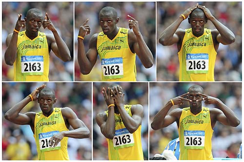 Usain Bolt of Jamaica gestures before his men's 200m heat of the athletics competition in the National Stadium at the Beijing 2008 Olympic Games in this August 18, 2008 combination photo. [Agencies]
