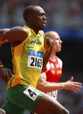 Usain Bolt of Jamaica sprints during his men's 200m heat of the athletics competition in the National Stadium at the Beijing 2008 Olympic Games August 18, 2008. [Agencies]