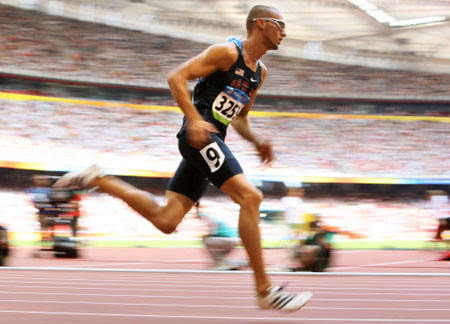 Jeremy Wariner of the US competes in the men's first round 400m heat 7 at the "Bird's Nest" National Stadium during the 2008 Beijing Olympic Games on August 18, 2008. Wariner finished first followed by US Virgin Islands' Tabarie Henry and Belgium's Cedric van Branteghem respectively.[Agencies]
