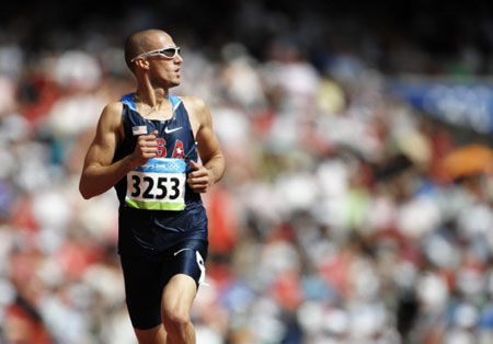 Jeremy Wariner of the US competes in the men's first round 400m heat 7 at the "Bird's Nest" National Stadium during the 2008 Beijing Olympic Games on August 18, 2008. Wariner finished first followed by US Virgin Islands' Tabarie Henry and Belgium's Cedric van Branteghem respectively.[Agencies]
