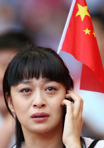 A spectator cries after China's Liu Xiang failed to compete in the men's first round 110m hurdles heat 6 at the "Bird's Nest" National Stadium during the 2008 Beijing Olympic Games on August 18, 2008. [Agencies]