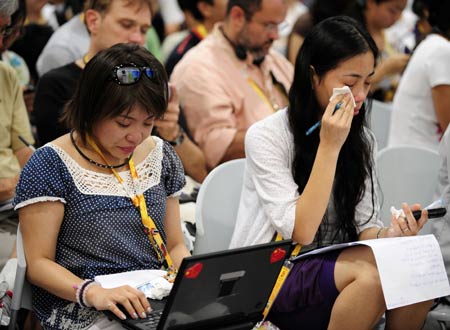 A reporter wipes tears from face during new conference at the National Stadium during the Beijing 2008 Olympic Games.