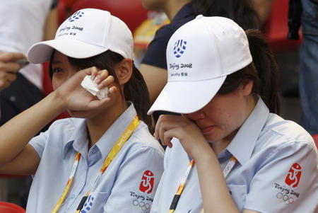 Security guards cry after China's Olympic champion Liu Xiang failed to start his 110 metres hurdles first-round heat of the athletics competition at the Beijing 2008 Olympic Games, August 18, 2008. After one false start Liu stopped before the first hurdle clutching his leg and then walked out of the stadium. [Agencies]