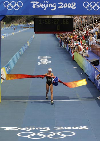 Emma Snowsill of Australia crosses the finish line first to take the gold medal in the women's triathlon competition at the Ming Tomb reservoir in the Changping District of northern Beijing during the Beijing 2008 Olympic Games August 18, 2008. [Agencies]