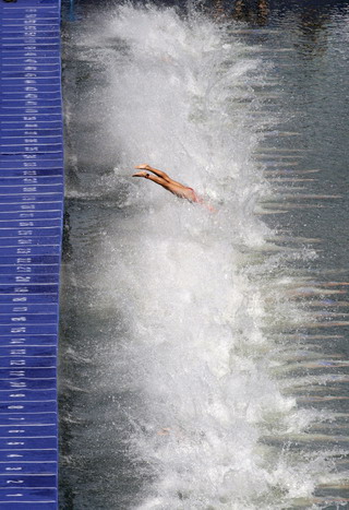 A competitor dives into the Ming Tomb reservoir in the Changping District of northern Beijing at the start of the women's triathlon during the Beijing 2008 Olympic Games August 18, 2008. [Agencies]