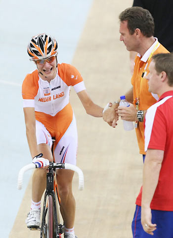 Track cyclist Marianne Vos of the Netherlands celebrates after winning the gold medal in the 2008 Beijing Olympic Games women's points race at the Laoshan Velodrome in Beijing on August 18, 2008. [Agencies]