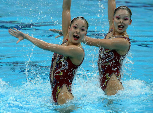 Jiang Tingting and Jiang Wenwen of China perform in the duet technical routine synchronised swimming event at the National Aquatics Center during the 2008 Beijing Olympic Games in Beijing on August 18, 2008.The Chinese pair finished the technical routine in fourth place.[Agencies]