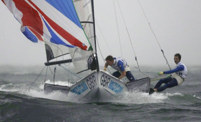 Stevie Morrison and Ben Rhodes of Britain sail in the 49er class just seconds before capsizing during the medal race at the Beijing 2008 Olympic Games in Qingdao, Shandong province, August 17, 2008.[Agencies]