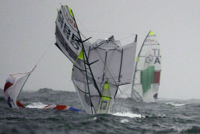 Stevie Morrison and Ben Rhodes of Britain, sailing in the 49er class capsize during the medal race at the Beijing 2008 Olympic Games in Qingdao, Shandong province, August 17, 2008.[Agencies]