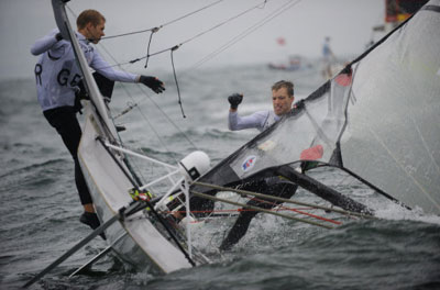 Sailors Jan Peter and Hannes Peckolt of Germany stand on their boat at the finish line in the 49er class medals race in the 2008 Beijing Olympic Games August 17, 2008 in Qingdao, China.[Agencies]