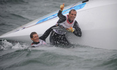 Sailors Piero and Giangranco Sibello of Itlay celebrate at the finish line in the 49er class medals race in the 2008 Beijing Olympic Games August 17, 2008 in Qingdao, China.[Agencies]