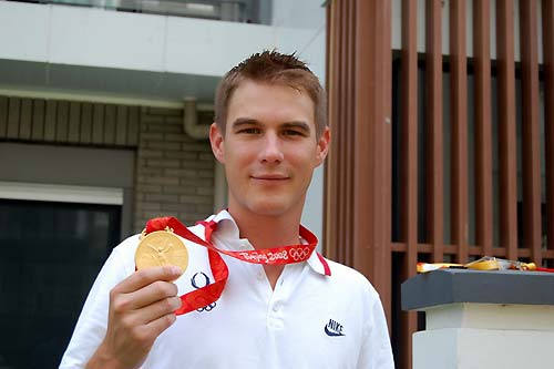 U.S. double trap shooter Glenn Eller showing his Gold Medal [Chinadaily.com.cn]