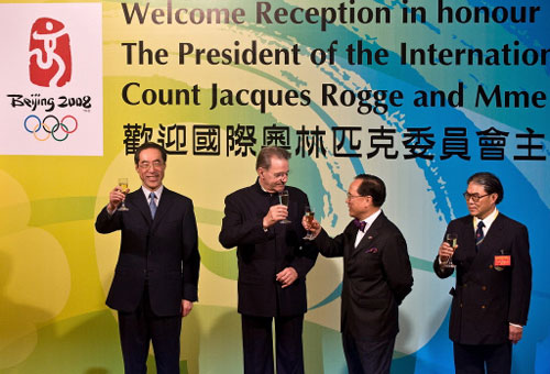 President of the International Olympic Committee (IOC), Jacques Rogge (2nd L), has a toast at a welcoming reception in honour of himself with Hong Kong's Chief Secretary Henry Tang (L), Chief Executive Donald Tsang (3rd L) and Hong Kong legislator and IOC member Timothy Fok (R) in Hong Kong on August 18, 2008. Rogge was in the southern Chinese city while the equestrian events are taking place there as part of the 2008 Beijing Olympic Games.[Agencies]