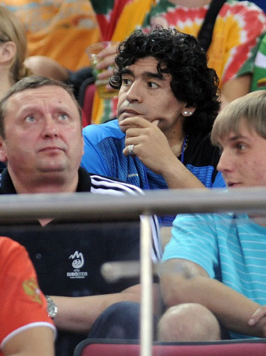 Argentina's football star Diego Armando Maradona attends the men's preliminary round group A basketball match Argentina vs Russia, on August 18, 2008 at the Olympic Basketball Arena in Beijing, as part of the 2008 Beijing Olympic Games.[Agencies]