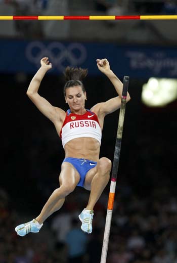 Yelena Isinbayeva of Russia competes during her women's pole vault of the athletics competition in the National Stadium at the Beijing 2008 Olympic Games August 18, 2008. [Agencies]