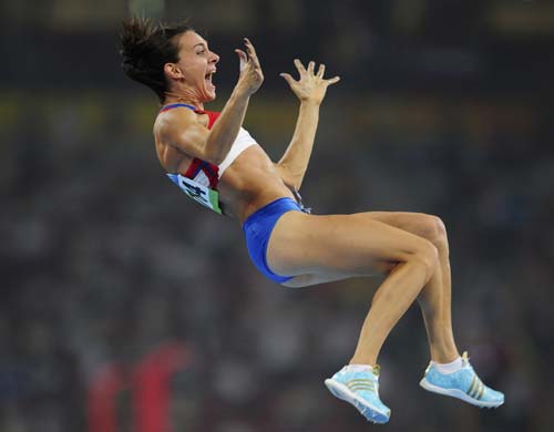 Yelena Isinbayeva of Russia breaks the world record during the women's pole vault final of the athletics competition in the National Stadium at the Beijing 2008 Olympic Games August 18, 2008. Isinbayeva cleared 5.05 metres, beating the previous mark of 5.04 metres she had set last month, after taking gold in the event. [Agencies]