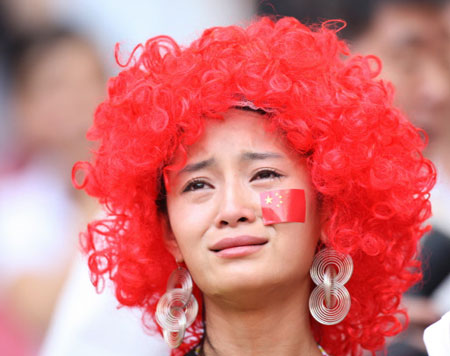 A spectator reacts after China's Liu Xiang failed to compete in the men's first round 110m hurdles heat 6 at the "Bird's Nest" National Stadium during the 2008 Beijing Olympic Games on August 18, 2008. [Agencies]