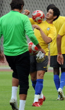 Brazil's Pato warms up during a training session ahead the 2008 Beijing Olympic Games men's football semi-final round in Beijing on August 18, 2008. Brazil will play against Argentina on August 19. [Agencies]