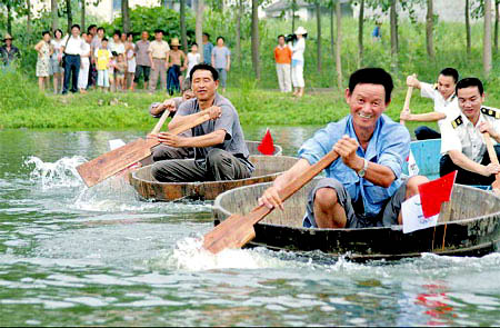 Men in Daqing, Zhejiang province, take part in their own version of Olympic rowing yesterday. [Xinhua]