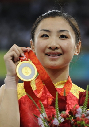 China's He Wenna shows her gold medal after the women's trampoline final of the artistic gymnastics event of the Beijing 2008 Olympic Games in Beijing on August 18, 2008. China's He Wenna won the gold, Canada's Karen Cockburn the silver and Uzbekistan's Ekaterina Khilko the bronze. [Agencies]