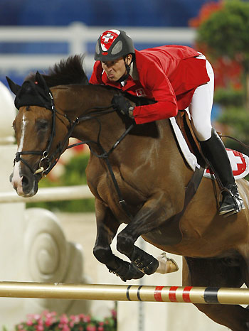 Steve Guerdat of Switzerland riding Jalisca Solier clears a fence during the equestrian jumping team competition at the Beijing 2008 Olympic Games in Hong Kong August 18, 2008. [Agencies]
