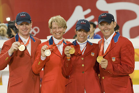 Members of the US team (L-R) McLain Ward, Beezie Madden, Laura Kraut and Will Simpson pose with their gold medals for the team equestrian show jumping of the Beijing 2008 Olympic Games in Hong Kong August 18, 2008. [Agencies]