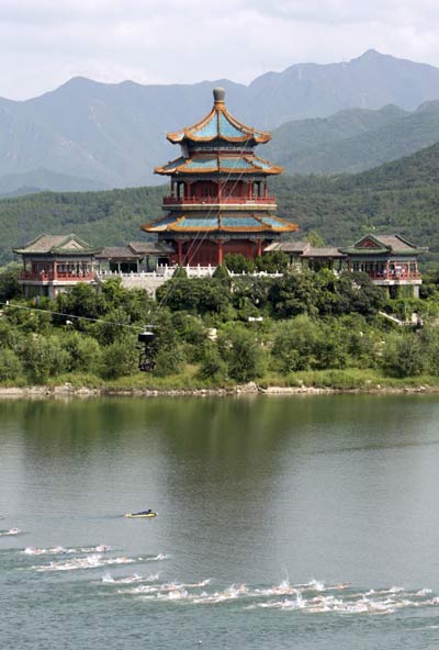 Competitors swim in the Ming Tomb reservoir in the Changping District of northern Beijing at the start of the women's triathlon during the Beijing 2008 Olympic Games August 18, 2008.[Agencies]