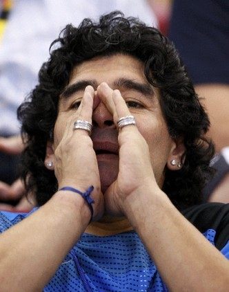 Argentine soccer great Diego Maradona cheers during the men's preliminary round Group A basketball game between Argentina and Russia at the Beijing 2008 Olympic Games August 18, 2008. [Agencies]