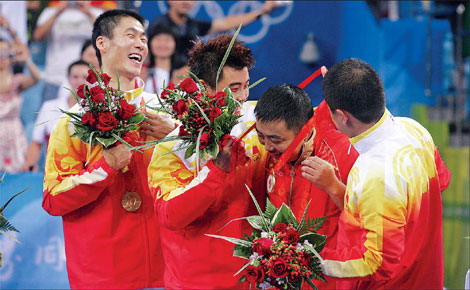 China's table tennis head coach Liu Guoliang (second from right) is garlanded with gold medals by Wang Liqin (left), Wang Hao (second from left) and Ma Lin after the Chinese won the men's team event August 18 2008. [China Daily]
