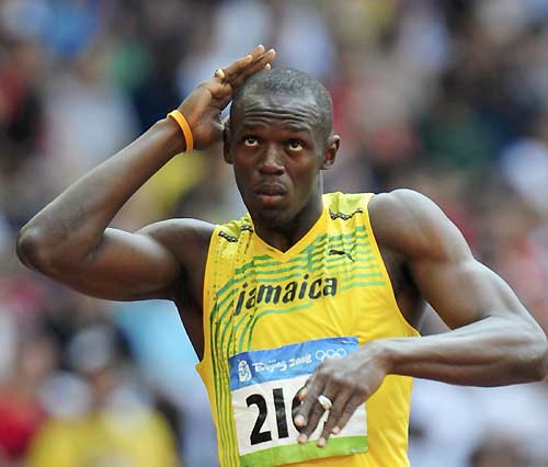 Usain Bolt of Jamaica gestures before his men's 200m heat of the athletics competition in the National Stadium at the Beijing 2008 Olympic Games August 18, 2008.[Agencies]