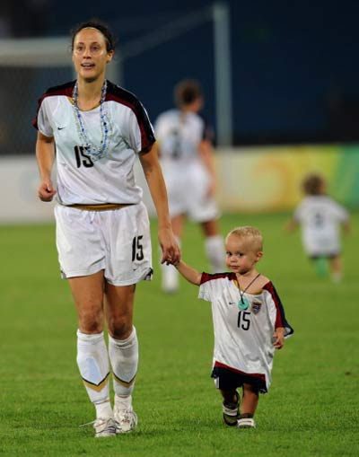 Kate Markgraf of the US walks on the pitch with her son Keegan after her team won the Beijing 2008 Olympic Games women's soccer semi-final match against Japan in Beijing on August 18, 2008 . The US won 4-2.[Agencies]